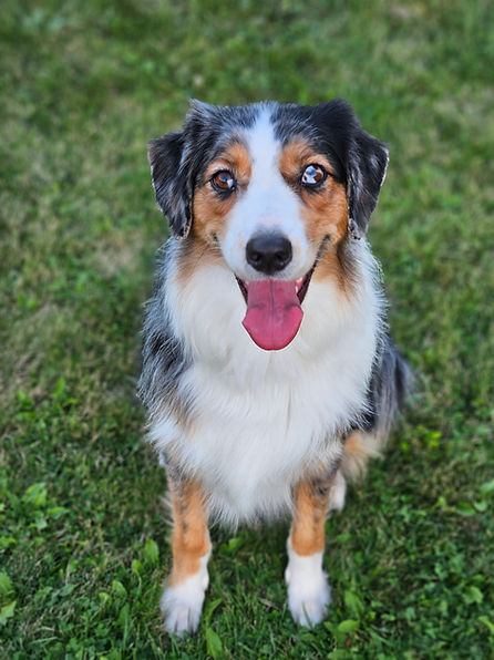 Grooming is a breeze as she has a moderate, not over done coat, which is less likely to catch stickers or get matted. She has done well with the Dremel for nail trims, bathing and blow drying. She is also good for weekly teeth brushing. Mila has an excellent "off switch" and relaxes well in the house and can be left alone for periods of time without much concern. Mila is medium energy and loves to do her zoomies first thing in the morning when let outside!